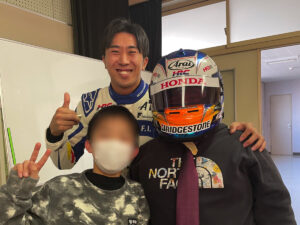 授業のあとは、小出選手の持参したヘルメットを触ったり被ったりし、最後はサイン会でノートや筆箱、体操着、ランドセルなどに小出選手のサインをもらって盛り上がりました。