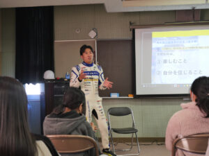 授業内容は、チームやレースの概要を説明した後、「大切なのは自分を信じること」と題して、小出選手が歩んできた道のりを紹介しながら、夢を持つことの大切さ、夢を実現するために大切にしてほしいことなどを子どもたちに伝えました。