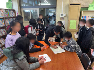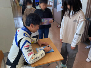 授業のあとは、小出選手の持参したヘルメットを触ったり被ったりし、最後はサイン会でノートや筆箱、体操着、ランドセルなどに小出選手のサインをもらって盛り上がりました。