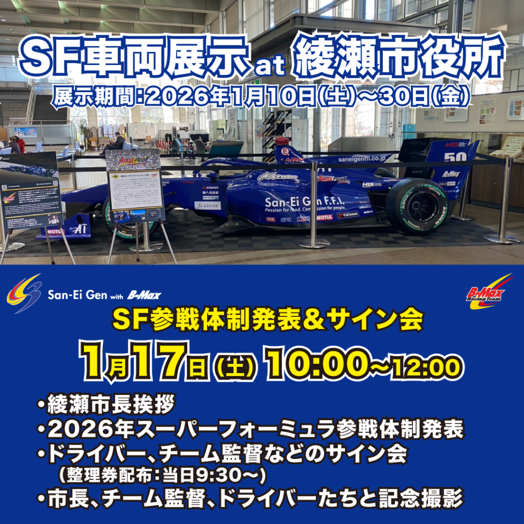 B-Max Racing Teamは、地域活性化で連携している神奈川県綾瀬市と共催で、今年も市庁舎ロビーにスーパーフォーミュラ(SF)車両を展示します。